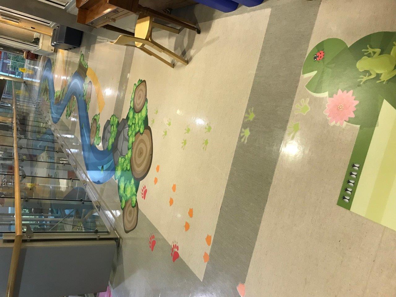 Floor decals are an easy addition to a passive environment to add vibrant color and help promote a healthy lifestyle by encouraging children to hop, skip & jump as they travel down the hallway. They were used in conjunction with a scavenger hunt to promote children to follow the path and interact with the various graphic elements.