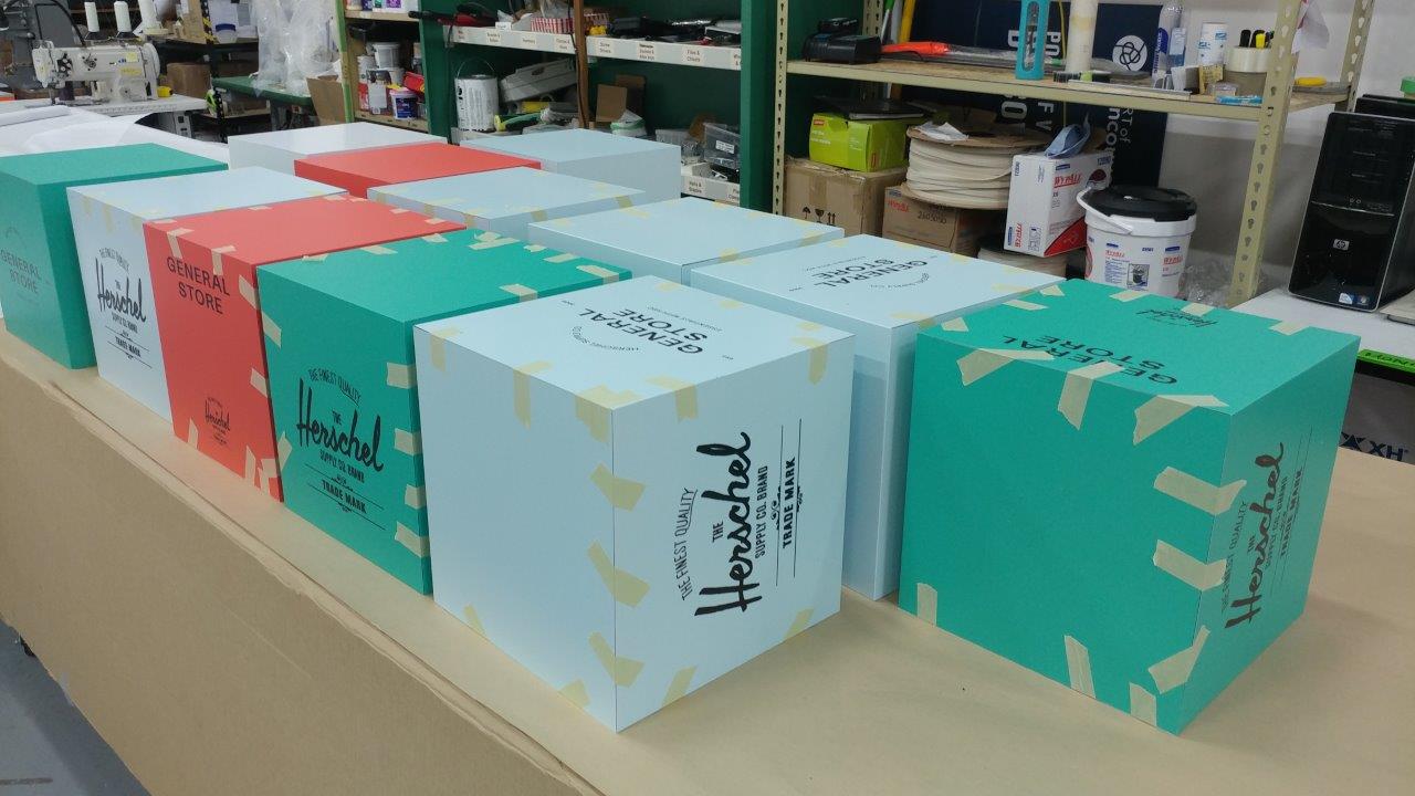 The project started with reviewing the pop-up stores’ rendering and the required graphics. While majority of the graphics were standard retail signage, there was one exception – custom fabricated cubes. A first for Multigraphics, these cubes were produced from 4mm thick Palboards that were printed on a flat sheet, cut to custom shape (designed by our R&D team), and then assembled together to form a cube.