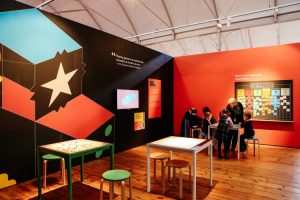 The visual language incorporated into the exhibition also nods to traditional board game designs, using bold colours, simple geometric shapes, oversized numerical markers and colourful cube-shaped grids, which act as plinths for game artefacts and break up the rest of the space.