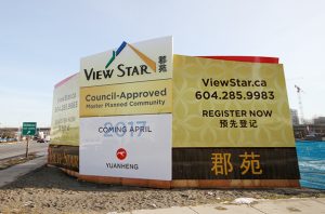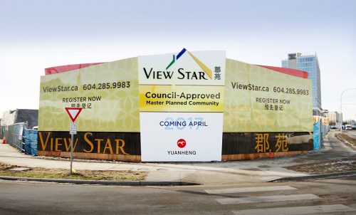 One of three 64’ wide x 20’ high signs for the new Yuanheng development in Richmond. These signs feature intricate patterns printed directly onto aluminium composite panels that also feature 3D lettering and reflective vinyl. The signs are on display at the corner of No 3 Road and Sea Island Way.
